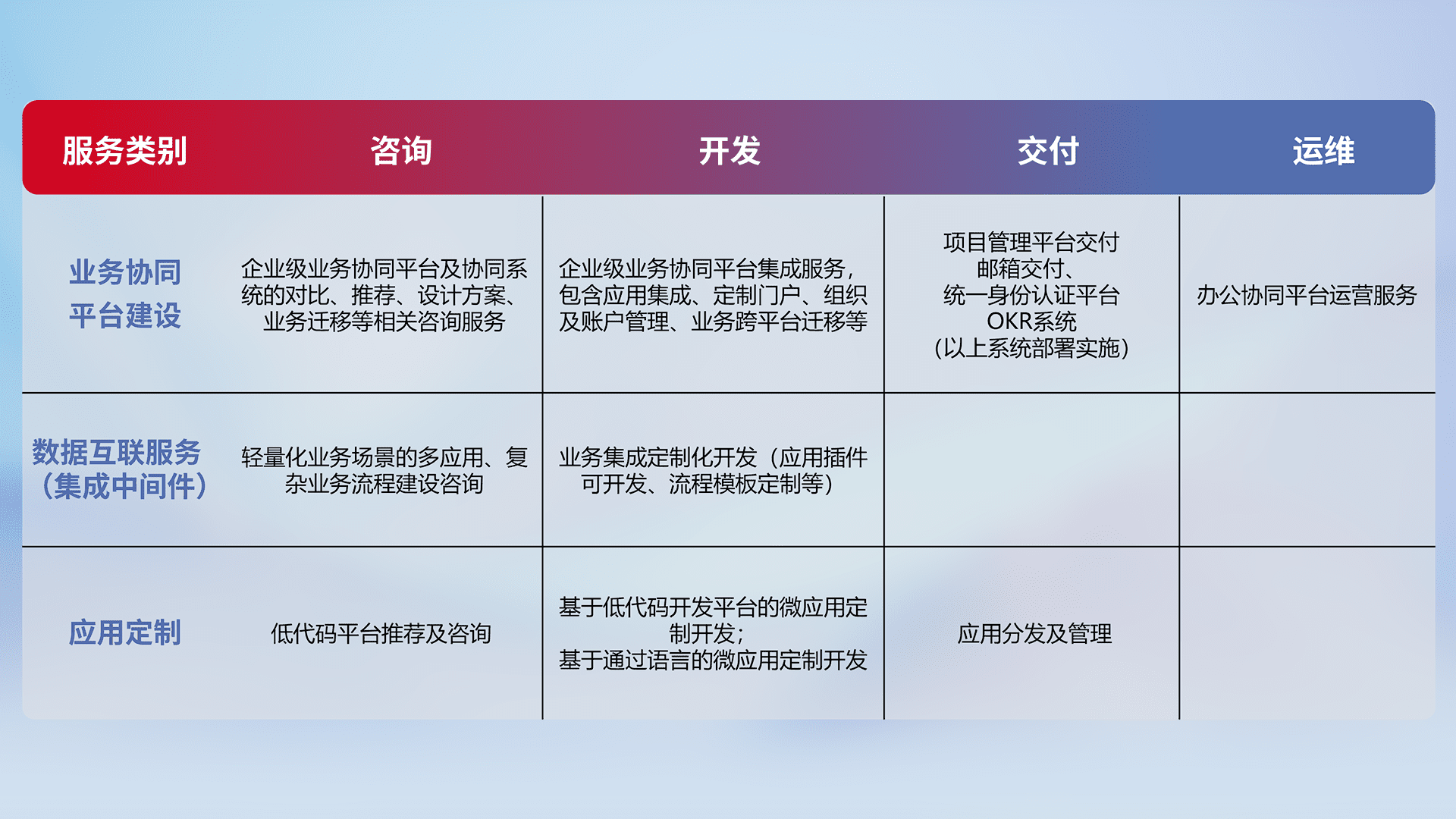 针对钉钉、、、企微、、、、IDaas等平台级产品提供产品的规划、、方案、、、交付、、、、定制化开发等服务,,,实现如统一协同办公、、智能客户服务、、、混合会议管理、、、智能数据查询、、等业务场景,,,实现数字化转型。。。。